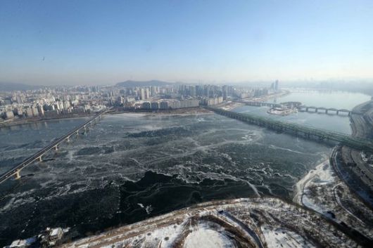 계속된 한파로 수도 서울을 관통하는 한강이 꽁꽁 얼었다. 휴일인 10일 서울 여의도 63빌딩 전망대에서 바라본 한강 일대가 얼음 조각과 함께 얼어 붙었다. 김상선 기자 |
