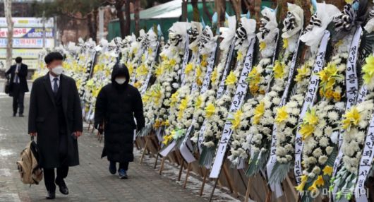 양부모 학대로 16개월만에 숨진 정인이 사건 첫 재판을 이틀 앞둔 11일 서울 양천구 남부지방검찰청 담장 앞에 정인양의 추모와 가해자의 엄벌을 촉구하는 근조화환이 설치돼 있다.
