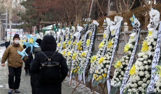 양부모 학대로 16개월만에 숨진 정인이 사건 첫 재판을 이틀 앞둔 11일 서울 양천구 남부지방검찰청 담장 앞에 정인양의 추모와 가해자의 엄벌을 촉구하는 근조화환이 설치돼 있다.