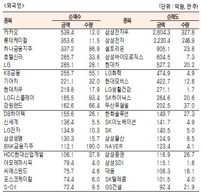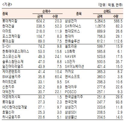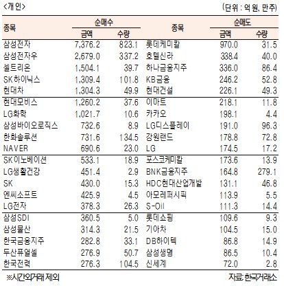 [표]유가증권 기관·외국인·개인 순매수·도 상위종목(1월 12일)