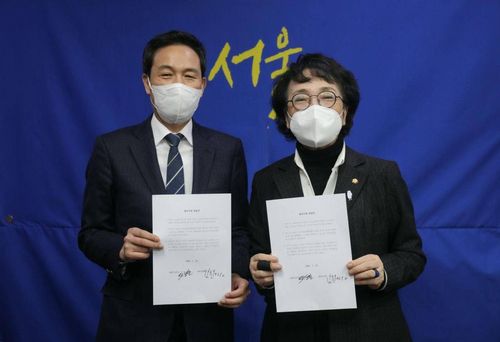 더불어민주당 우상호 의원(왼쪽)과 열린민주당 김진애 의원이 12일 국회에서 만나 양당 후보 단일화 추진 내용을 담은 합의문에 서명한 모습 [열린민주당 제공] |