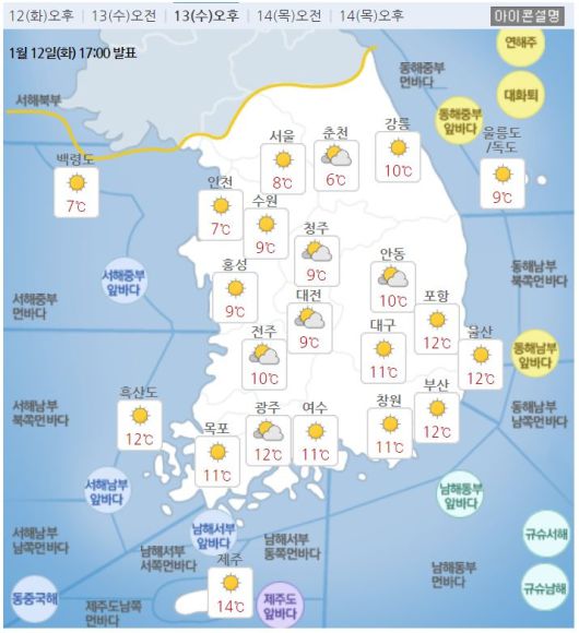 2021년 1월 12일 오후 5시 기준 13일 오후 날씨 예보 [기상청 제공] |