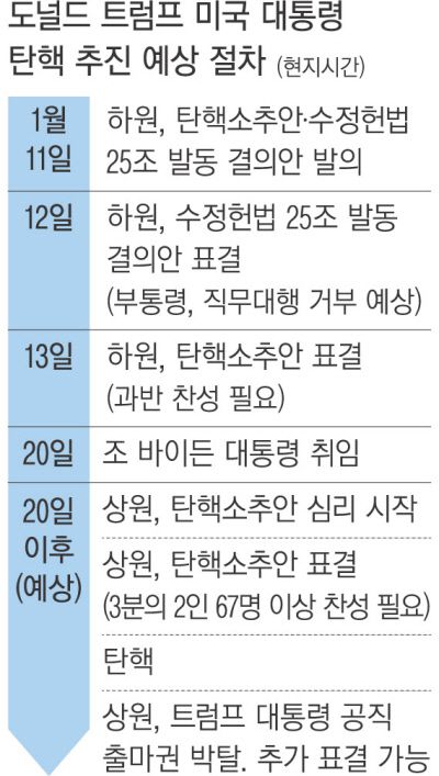 민주당은 이날 탄핵안과 함께 마이크 펜스 부통령에게 수정헌법 25조 발동을 촉구하는 결의안도 발의했다. 부통령과 내각 과반 찬성으로 대통령을 직무에서 배제시키고 부통령이 대행을 맡는다면 탄핵안을 처리하지 않을 수도 있다는 메시지다. 하지만 펜스 부통령은 25조 발동에 부정적인 것으로 알려졌다. 낸시 펠로시 하원의장은 이 결의안이 통과된 후 펜스 부통령이 24시간 이내에 응하지 않으면 탄핵안을 처리하겠다고 예고했다. 스테니 호이어 민주당 하원 원내대표는 12일 수정헌법 25조 발동 촉구 결의안을 처리하고, 13일 탄핵안을 표결에 부칠 계획이라고 밝혔다.