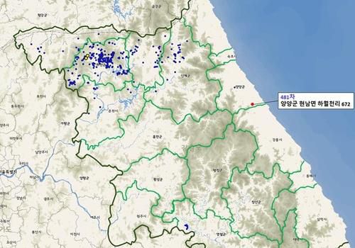 강릉 인근 양양군 야생 멧돼지 발견 지점. [강원도 제공·재판매 및 DB 금지] |