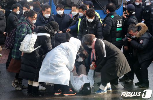 (서울=뉴스1) 성동훈 기자 = 학대 받아 숨진 것으로 알려진 정인이 양부모에 대한 첫 재판이 열린 13일 오전 서울 양천구 서울남부지방법원에서 시민들이 호송차량의 앞을 막으며 사형을 외치고 있다. 2020.1.13/뉴스1zenism[© 뉴스1코리아(news1.kr), 무단 전재 및 재배포 금지]