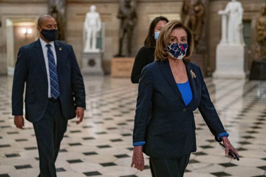 미국 민주당 소속인 낸시 펠로시 하원의장(오른쪽)이 12일(현지시각) 자신의 사무실에서 하원 전체회의장으로 걸어가고 있다. 워싱턴/UPI 연합뉴스 |