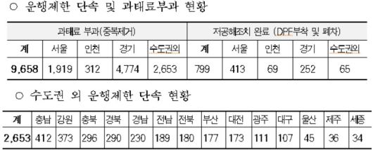 단속 차량 10대 중 8대는 서울 이외 지역 차량이었다. 경기도가 4774대(49.4%)로 가장 많았다. 충남(412대), 강원(373대), 충북(296대), 경북(290대) 등 수도권 외 차량이 2653대(27.4%)였다. 서울은 1919대(19.8%)였다.