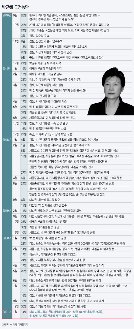 박근혜 전 대통령 사건이 두 번의 대법원 재판을 거쳐 완전히 마무리됐다. 2016년 7월 미르재단 언론보도를 시작으로 불법 의혹이 불거진 지 4년6개월 만이다. 박 전 대통령은 불법에 손댄 적 없다고 주장했지만 여론은 가라앉지 않았다. 그해 10월24일 개헌 카드를 꺼내들었지만, 바로 그날 최서원씨(옛 이름 최순실씨)의 태블릿PC가 보도됐다.
