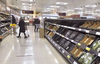 지난 11일 영국 북아일랜드 벨파스트에 위치한 쇼핑 센터의 한 슈퍼마켓 신선식품 매대가 텅 빈 모습. [AP] |
