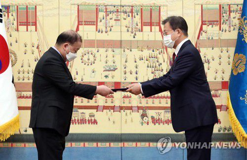 (서울=연합뉴스) 임형섭 기자 = 문재인 대통령은 14일 오전 청와대에서 강창일 신임 주일대사에게 신임장을 수여했다.
