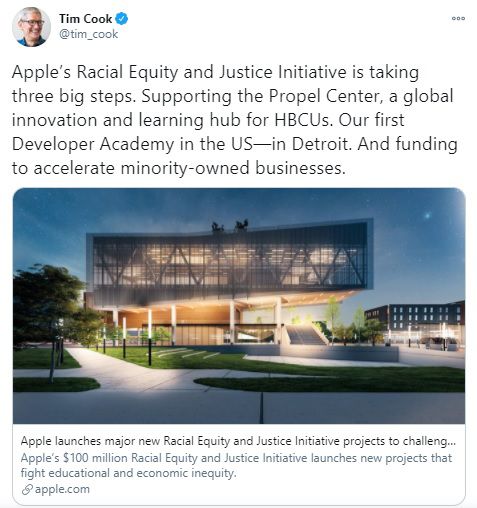 앞서 쿡 CEO는 지난해 백인 경찰관의 가혹행위로 흑인 남성 조지 플로이드가 숨진 사건 직후 직원들에게 보낸 메모에서 형사 사법 제도나 교육, 의료 등 사회 여러 부문에 남아있는 인종차별 문제를 지적하면서 "모든 이들을 위해 더 나은, 더 정의로운 세계를 만드는 데 헌신해야 한다"고 촉구했다.