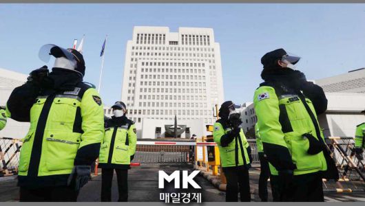 박근혜 전 대통령의 재상고심 선고 공판이 열리는 14일 오전 서울 서초구 대법원 앞에서 경찰이 만약의 사태에 대비해 출입을 통제하고 있다.2021.1.14.이승환기자 |