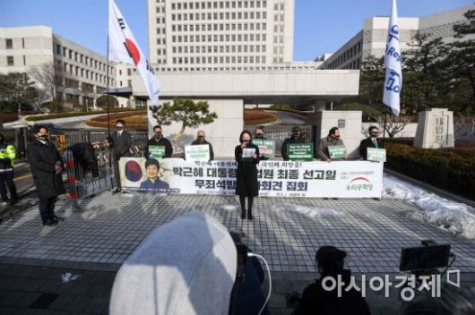 국정농단 사건 등으로 재판에 넘겨진 박근혜 전 대통령 재상고심일인 14일 서울 서초구 대법원 앞에서 우리공화당 소속 관계자들이 박 전 대통령 무죄를 촉구하는 기자회견을 하고 있다./강진형 기자aymsdream@ |