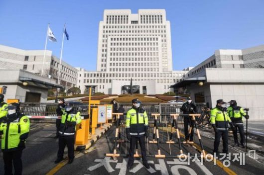 국정농단 사건 등으로 재판에 넘겨진 박근혜 전 대통령 재상고심일인 14일 서울 서초구 대법원 앞에 경찰병력이 출입을 통제하고 있다./강진형 기자aymsdream@ |