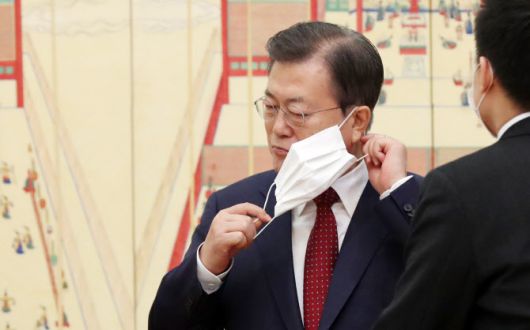 문재인 대통령이 14일 청와대에서 강창일 주일대사에게 신임장을 수여한 후 기념촬영을 위해 마스크를 벗고 있다.(사진=연합뉴스) |