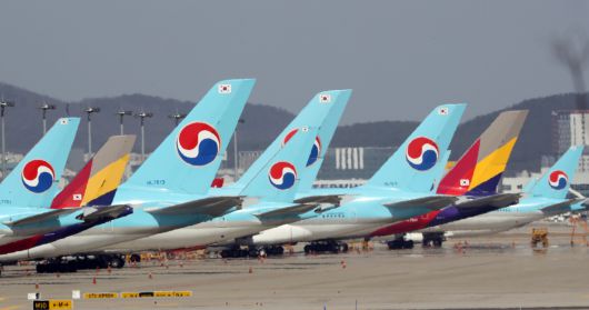 인천국제공항에 한국의 양대항공사인 대한항공과 아시아나 항공의 항공기가 서 있다. [연합] |