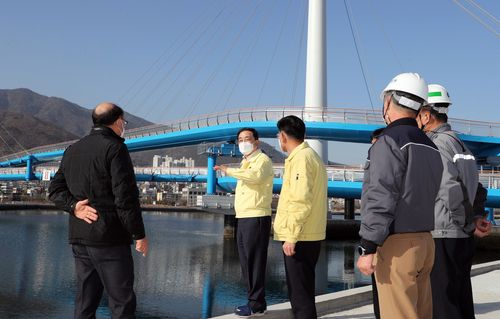 ▲ 허성무 경남 창원시장은 14일 마산해양신도시 건설 현장을 방문해 사업추진 상황을 점검했다. 허 시장은 신도시 내 친환경 수변 산책로 등을 조속히 조성해 시민 휴가 공간을 마련하겠다고 말했다. 시는 최근 마산해양신도시 개발 방향을 '스마트 기술 기반 글로벌 감성 허브'로 정한 바 있다. (창원=연합뉴스)