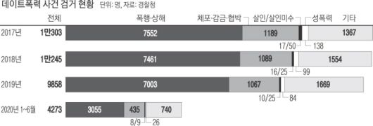 경찰청이 공개한 ‘데이트폭력 사건 검거 현황’을 보면 2016~2019년 연평균 9693명의 데이트폭력 가해자가 입건됐다. 경찰은 지난해 7월1일부터 8월31일까지 ‘데이트폭력 집중신고기간’을 운영해 47명을 구속했다. 한 해 1만건에 육박하는 검거 건수가 실제 발생하는 데이트폭력보다 현저히 적다는 분석도 있다. 데이트폭력을 수사기관에 신고하기까지 많은 용기가 필요하기 때문이다. 서울시 여성가족재단의 2018년 ‘데이트폭력 피해 실태조사’를 보면 서울에 사는 여성 10명 중 9명은 교제 중인 이성에게 데이트폭력을 당한 경험이 있다. 신체적 폭력을 겪은 뒤 경찰에 신고했다는 응답은 9.1%에 불과했다.