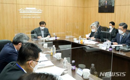 [서울=뉴시스] 서훈 국가안보실장이 진ㄴ해 11월5일 국가위기관리센터 소회의실에서 열린 국가안전보장회의(NSC) 상임위원회 회의를 주재하고 있다. (사진=청와대 제공) 2020.11.05. photo@newsis.com |