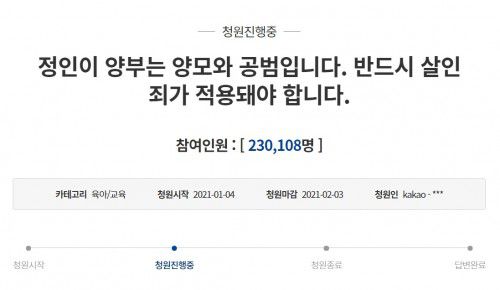 아시아투데이 박아람 기자 = '정인이 사건'의 양부에게도 살인죄를 적용해달라는 국민청원이 20만명 이상의 동의를 얻었다.