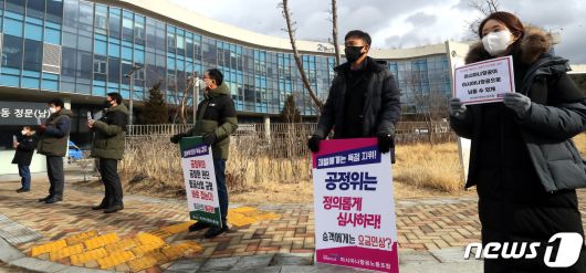 (세종=뉴스1) 장수영 기자 = 민주노총 전국공공운수노조 아시아나항공노조 조합원들이 15일 정부세종청사 공정거래위원회 기자실에서 '대한항공-아시아나항공 기업결합 불승인 촉구' 기자회견을 갖고 있다. 2021.1.15/뉴스1