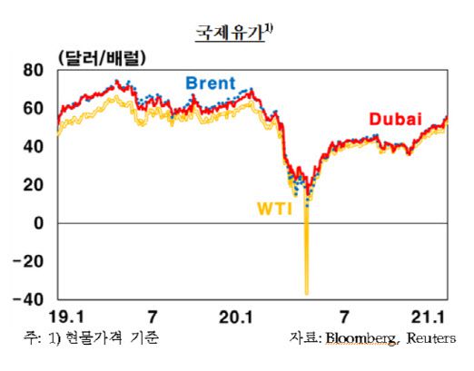 최근 국제유가(두바이유 기준)는 백신 접종 개시로 글로벌 경기 회복 기대감이 커진 가운데 석유수출국기구(OPEC)의 생산량 조절, 미 원유생산 감소 등 수급 상황의 변화로 인해 배럴당 50달러대 중반 수준으로 올랐다.