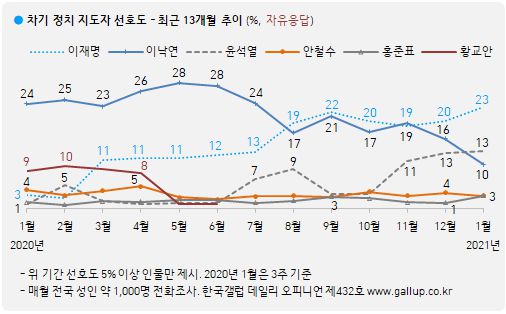 15일 한국갤럽에 따르면, 지난 12~14일 사흘간 전국 만 18세 이상 1000명에게 자유응답 형태로 '다음 대통령감으로 누가 좋다고 생각하느냐'고 물은 결과 이재명 경기지사 23%, 윤석열 검찰총장 13%. 이낙연 민주당 대표 10% 순으로 조사됐다.