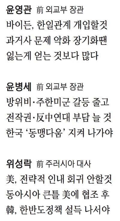 ▷윤병세 전 외교부 장관=바이든 행정부의 신임 외교안보팀은 트럼프 행정부의 한반도 정책에 대해 비판적이다. 한국이 일본, 호주 못지않은 동맹 파트너라는 믿음을 초기부터 강하게 심어주는 것이 중요하다. 특히 해서는 안 될 것에도 유의해야 한다. 북한 문제와 관련해 우리 입장을 강의하려 하거나 한미동맹 재조정 문제를 먼저 제기해 미국 측의 반발만 사는 방식이 되면 첫 단추부터 잘못 끼우게 되는 것이다.