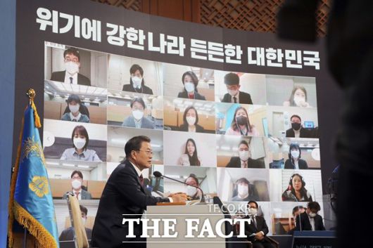 문재인 대통령이 18일 오전 청와대 춘추관에서 온·오프 혼합 방식으로 열린 '2021 신년 기자회견'에 참석해 취재진의 질문에 답변하고 있다. /뉴시스 |