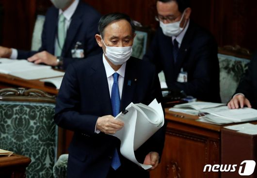 마스크를 착용한 스가 요시히데 일본 총리가 18일 오후 국회에서 시정방침연설을 하기 위해 단상으로 이동 중이다. © 로이터=뉴스1 |