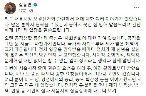 이어 "여전히 부족함을 느낀다. 더 성찰하고 대안을 찾는 고민을 해야 한다는 생각이 들었다"면서 "이런 저런 보도가 되기 훨씬 전에 이미 거절의 의사를 분명하게 전했다"고 말했다.