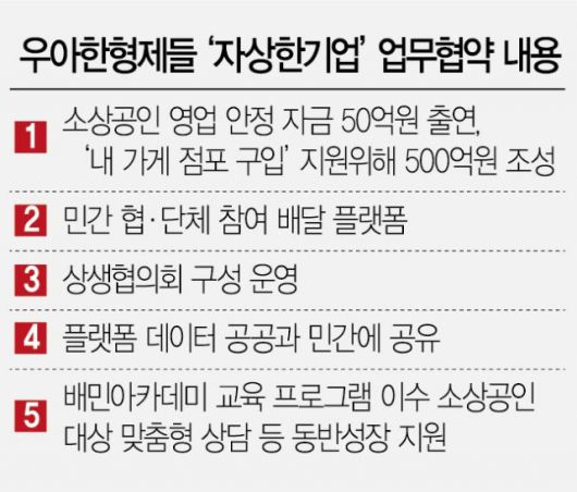 우아한형제들은 앞으로 업력 10년 이상의 소상공인들이 안정적으로 영업할 수 있도록 50억 원을 출연해 '내 가게 점포' 구매를 지원할 계획이다. 또 민간 협회 및 단체가 참여하는 '배달플랫폼 상생협의회' 운영에 적극적으로 참여해 소상공인 지원 제도 마련에 동참하기로 했다.