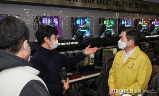 [제주=좌승훈 기자] 원희룡 제주지사가 18일 제주시 노형동에 있는 PC방을 찾아 강화된 방역 조치에 따른 관련 업종 종사자들의 애로사항을 듣고 있다. [사진=제주도 제공] |