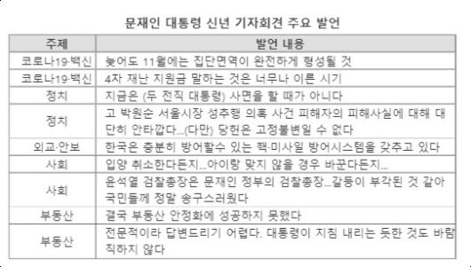 국내 백신 도입과 관련한 질문에서도 마찬가지였다. 문 대통령은 "늦어도 11월에는 (우리나라가) 집단면역이 완전하게 형성될 것"이라고 말한 것을 두고 시민들은 시기가 너무 늦다는 실망감을 드러냈다. 코로나19 상황이 엄중한 가운데 '11월 집단면역'이 1월에 전하는 메시지로는 아쉽다는 것이다.