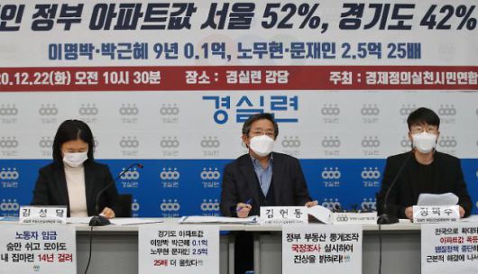 경실련은 "전날 문 대통령은 신년기자회견을 통해 집값 상승의 원인을 저금리와 유동성 61만 가구 등 인구감소에도 불구하고 급격한 가구 수 증가로 인한 공급 부족이라고 발언했다"며 "이런 잘못된 원인진단을 통해 정부의 투기 조장에 대한 사과를 회피하고 있다"고 비판했다.