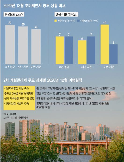 고농도 미세먼지가 발생하는 지난해 12월에도 하늘이 맑았다. 대기 흐름이 원활했고 2차 미세먼지 계절관리제(2020년 12월 1일~2021년 3월 31일) 시행에 따른 정책 영향이라고 정부는 평가했다.