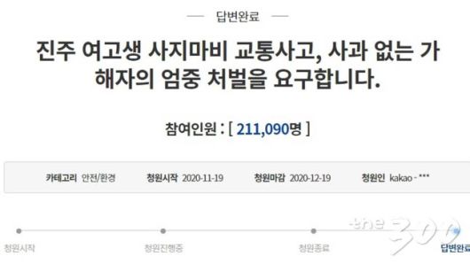 청원인은 가해 차량 운전자가 진심어린 사과를 하지 않았고, 1심에서도 금고 1년형을 받은 것은 너무 가벼운 처벌이라며 엄중처벌을 요구했다.