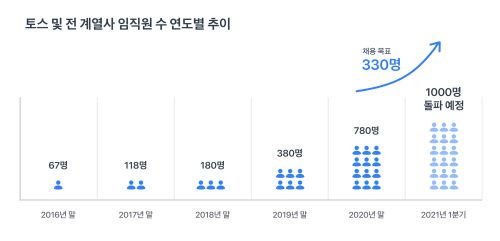 토스, 토스인슈어런스, 토스페이먼츠의 지속 성장과 더불어 토스증권, 토스혁신준비법인(가칭 토스뱅크)의 출범이 예정된 데 따른 것이다. 이에 따라 토스와 4개 계열사를 더한 전체 조직 규모는 올 1분기 이내에 1000명을 돌파할 전망이다.