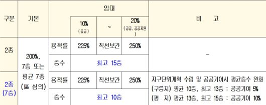 또 임대기간에 따라 10년 단위로 용적률을 10%포인트(p)씩 차등 적용하도록 했다. 예를 들어 임대기간이 10년인 공공지원민간임대주택의 경우 제2종일반주거지역은 230%, 제3종일반주거지역은 280% 까지 완화가능하다.