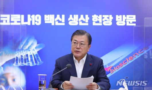 [안동=뉴시스]추상철 기자 =문재인 대통령이 최태원 SK회장과 함께 20일 오전 경북 안동시 SK바이오사이언스 공장에서 열린 '코로나19 백신 기업 영상 간담회'에 참석해 발언하고 있다. 2021.01.20. scchoo@newsis.com |