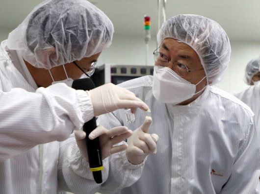 문재인 대통령이 20일 오전 경북 안동시 SK바이오사이언스를 방문해 코로나19 백신 생산 시설을 시찰하며 이상균 공장장의 설명을 듣고 있다. 청와대 제공 |