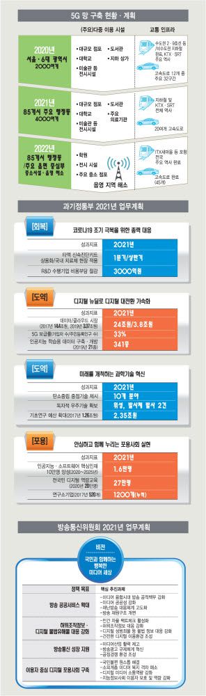 과기정통부의 2021년 ICT 분야 업무계획은 지난해 코로나19 위기로 시작된 디지털뉴딜 등 대규모 정부 투자를 확대, 가시적인 성과를 창출하는 데 초점을 맞췄다는 분석이다.