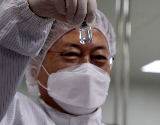 문재인 대통령이 20일 오전 경북 안동시 SK바이오사이언스 공장을 방문해 코로나19 백신 생산 시설을 시찰하던중 백신을 들어 보이고 있다. 뉴시스 |