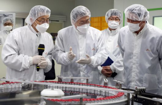 문재인 대통령이 20일 오전 경북 안동시 SK바이오사이언스 공장을 방문해 코로나19 백신 생산 현장을 시찰하고 있다. (사진=연합뉴스) |