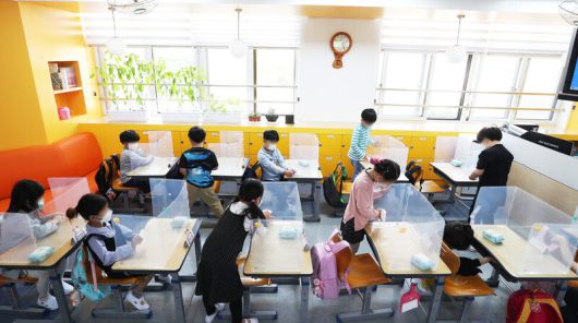 순차적 등교수업이 이뤄진 지난해 5월 경기도 수원시 한일초등학교에서 1학년 학생들이 소독용 물티슈로 책상과 투명 칸막이 등을 닦고 있다. 연합뉴스 |