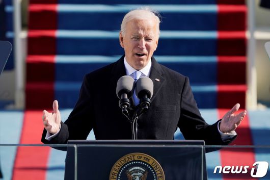 조 바이든 미국 대통령이 20일(현지시간) 의회 의사당 앞에서 열린 취임식에서 취임연설을 하고 있다. © 로이터=뉴스1 © News1 구윤성 기자 |