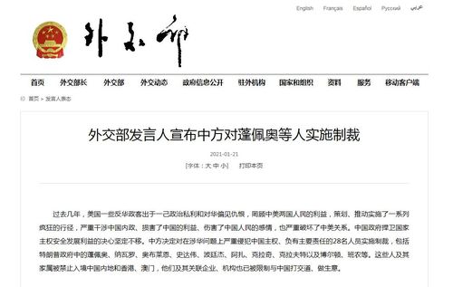 중국 외교부가 다른 나라, 특히 미국에 대해 새벽에 제재를 발표하는 것은 극히 이례적인 일로 중국 정부는 트럼프 행정부가 물러나기만을 기다렸다는 듯이 마이크 폼페이오 국무장관 등을 제재했다.