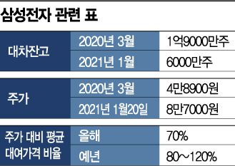 구체적으로 보면 삼성전자의 대차잔고는 지난해 3월 1억9000만주에서 최근 6000만주까지 줄었다. 대차거래가 줄면서 대여가격도 오르지 않았다. 반면 주가는 4만8900원(2020년3월16일)에서 8만7000원(올해 1월20일)으로 큰 폭으로 올랐다. 특히 정부가 공매도 제도를 개선해 재개한다면 대차 수요는 더욱 커질 것으로 보인다. 정인지 유안타증권 애널리스트는 "지금은 주가 상승 과정에서 잔고가 감소해 공매도를 재개할 경우 대차 수요가 증가할 수 있는 원인이 되고 있다"고 분석했다.