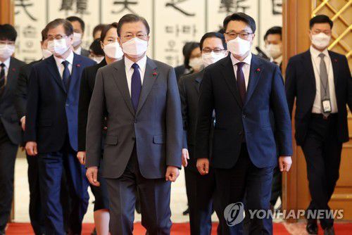 환담장 이동하는 문재인 대통령과 김진욱 공수처장 |