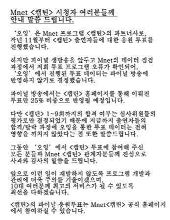 엠넷 '캡틴' 측은 파이널 생방송을 하루 앞두고 투표 오류를 공지했다. '캡틴' 측은 20일 공식 홈페이지를 통해 "파이널 생방송을 앞두고 투표 데이터를 점검하는 과정에서 투표 데이터 관리 프로그램의 오류를 확인했다"며 "해당 데이터 전체를 파이널 방송에 반영하지 않기로 했다"고 밝혔다.